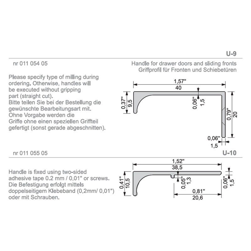 Handle is fixed using two-sided adhesive tape 0,2 mm / 0,01" or screws.
