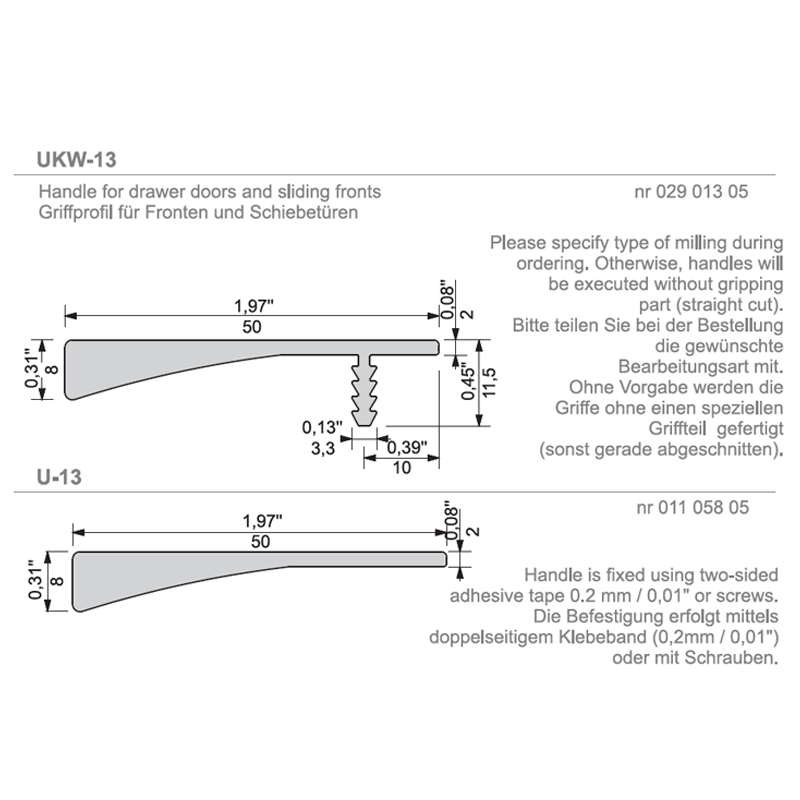 Handle is fixed using two-sided adhesive tape 0,01" / 0,2 mm or screws.